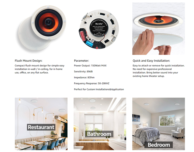- Flush Mount Design - Wide sound dispersion designed speakers easily integrate with new and existing audio systems, traditional Passive speaker design, simply drive power from your home audio receiver or amp