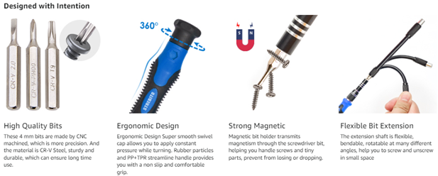 • 【Humanized Design】This electronic screwdriver set has been professionally designed to maximize your repair capabilities. The screwdriver features a particle grip and rubberized, ergonomic handle with swivel top, provides a comfort grip and smoothly spinning. Magnetic bit holder transmits magnetism through the screwdriver bit, helping you handle tiny screws. And flexible extension shaft is useful for removing screw in tight spots