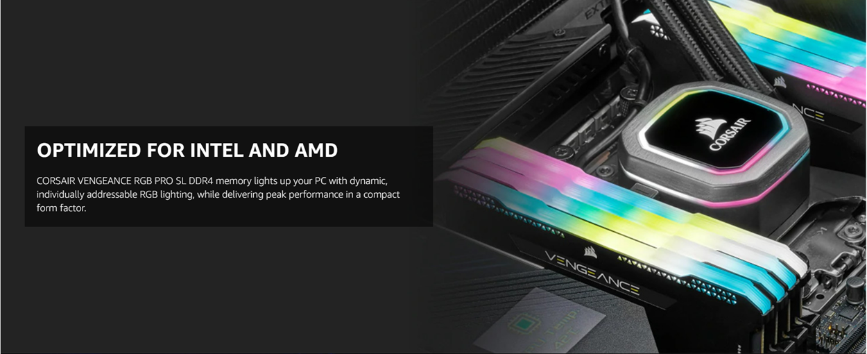 CORSAIR VENGEANCE RGB PRO SL DDR4 memory lights up your PC while delivering peak performance in a compact form factor just 44mm tall for wide compatibility with CPU coolers. Every module boasts ten bright, individually controlled RGB LEDs for brilliant illumination. Take control with CORSAIR iCUE software and completely customize every module’s lighting to match your system, create your own custom lighting profiles, and synchronize lighting across all your CORSAIR products. A custom PCB provides superb signal quality for superb performance and stability on the latest Intel® and AMD DDR4 motherboards, while tightly screened memory chips unlock superior overclocking ability. For mesmerizing, completely customizable RGB lighting and the best in DDR4 performance, equip your PC with VENGEANCE RGB PRO SL.