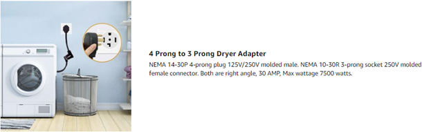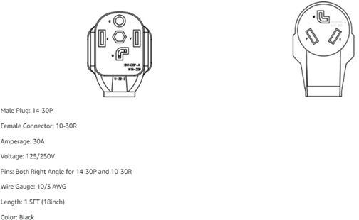 - 【Adapter for 240-Volt Electric Clothes Dryers】Dryer Outlet Ddapter, Dryer adapter cord 14-30 Plug to 10-30 Receptacle, NEMA 14-30P 4-prong male electrical plug is 125/250V, NEMA 10-30R 3-prong female plug connector is 250V. 30 AMP, Max wattage 7500W-Black