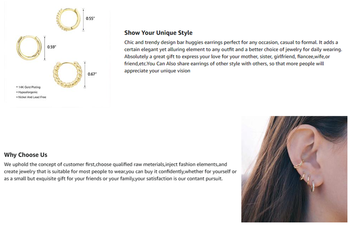 14k gold plated brass small huggie hoop earrings. Hypoallergenic, Nickel and Lead-Free, no rust and fading. Flexible clasp, easy to open and close. If the clasp not easy to close, you can adjust the earpins