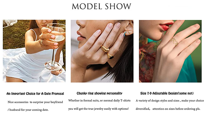 - [Adjustable Gold Thick Ring]---We provide 10 gold chunky ring styles. Their default size is size 7. They can be fine-tuned from size 6 to size 9. The opening can be adjusted to a greater degree for easy wearing.