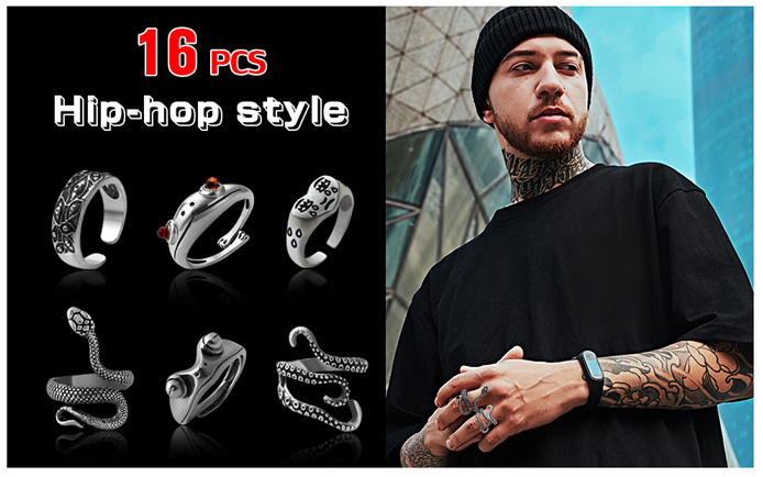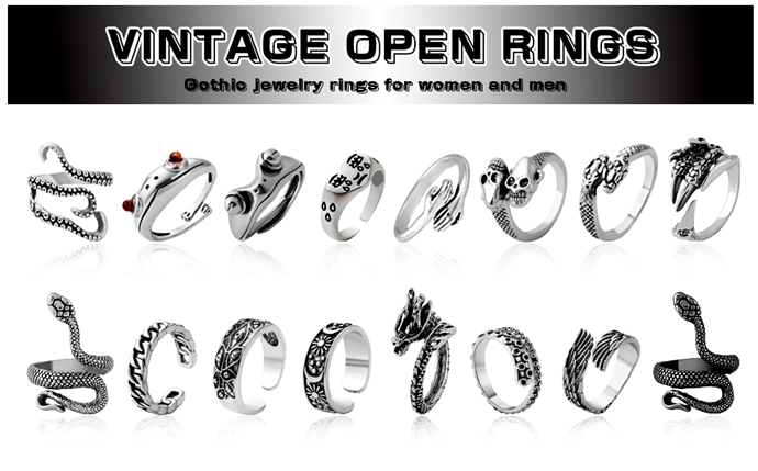 - FASHION COOL - Gothic jewelry rings pack design with 16 pcs different vintage styles, including frog ring, snake ring, skull ring, dragon ring, claws ring, octopus ring and moon ring, evil eye ring, cross ring, wing ring and more