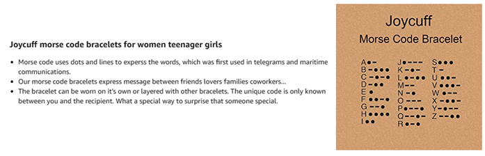 The stainless steel bead on the bracelet represents a "dot" in code, and the hematite bead represents a "dash".