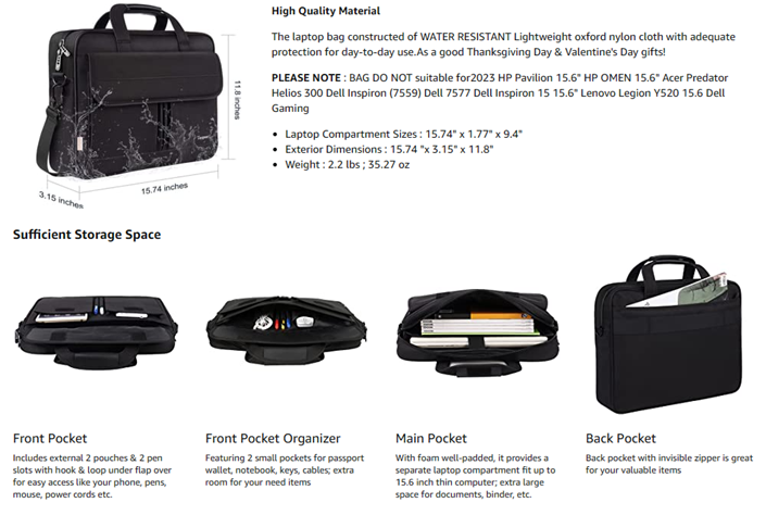• Multi-Compartment Organizer: The computer bag includes external 2 pouches & 2 pen slots and inside several slots in front large pocket with magic tape under flap over, storage pen holders, documents, binder, power cords, mouse; 1 main zipper Pocket with foam padded sleeve fits most 15 15. 6 inch Laptop notebooks MacBook Ultrabook Chromebook; back invisible zipper pocket for your valuables