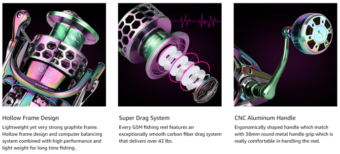 - 【Eye-catching appearance】Sougayilang GSM fishing reel have been fully upgraded on the basis of the previous generation of the LY colorful fishing reels, with a more eye-catching appearance and more powerful performance. The eye-catching appearance brings you a different fishing mood that will look great on any rod you own.The “Colors” spinning reels deliver dependable performance coupled with unbeatable value and eye-catching cosmetics to show angler's attitude and personality.