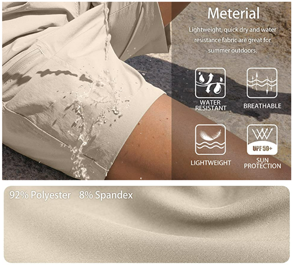 Sun Protection: The lightweight bermuda shorts made with stretch-woven fabric which build-in UPF 50+ to provide great protection against harmful ultraviolet rays during outdoor activities.