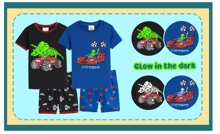 Feature: Special design, glow in the dark. Soft sleepwear top features round neck, short sleeve, pants with elastic waist band, moisture wicking, stretchy, non-slip and painless, easy on/off.