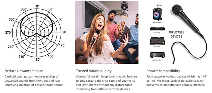 Suitable for Many Scenarios - The dynamic cardioid microphone picks up sounds and reduce all background noise effectively, it will reproduce them faithfully. Great for professional KTV, stage performance, business meeting, public speaking, family or friend party, outdoor performances, etc. Suitable for either the beginners or the professional users.