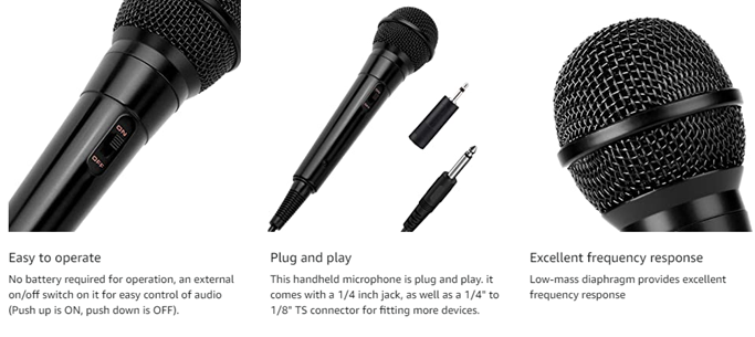 Robust Compatibility - This handheld wired microphones comes with a 1/4 inch jack, as well as a 1/4" to 1/8" TS connector for fitting more devices. Fully supports various devices which has 1/4" or 1/8" Mic input, such as DVD, television, KTV audio, reverberator, mixer, tour bus, etc.