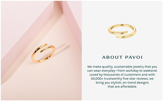 ✦ SUSTAINABILITY ✦ PAVOI is dedicated to sustainability throughout our entire product cycle. Our jewelry is made from 100% recycled materials and we package in 99% recycled and compostable materials. We work to reduce our carbon emissions and offset plastic consumption by removing 275,000 bottles from oceans annually. We are committed to maintain a balanced and eco-friendly business that minimizes our environmental impact. Trust that PAVOI is continuously working towards a greener future.