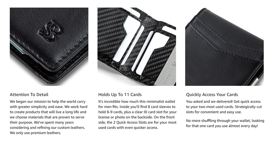 SLIM YOUR POCKET– HOW IT WORKS. This slim wallets for men reduces bulk with an efficient minimalistic design that makes everything easier. Best fits 7-10 credit cards, an ID plus US bills. Total of 11 available card slots (including 2 secret pockets). Perfect for carrying all debit, credit and all other cards. Store cash using the innovative stainless- steel money clip. Wallet Size: 4.3” in x 3.1” in x 0.6” in