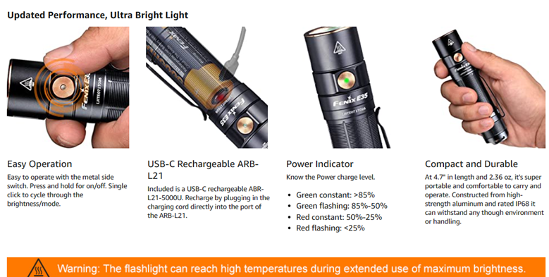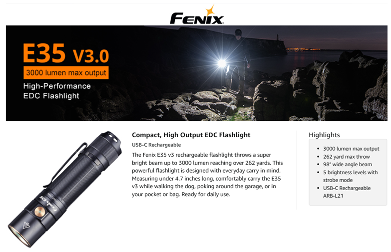 • Content in Package - Fenix E35 v3.0 flashlight, USB-C rechargeable, USB-C charging cable, Lanyard, and a LumenTac organizer