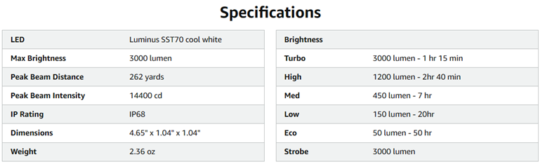 • DURABLE- The aluminum body of the E35 v3.0 makes it impact resistant up to 1.5 meters. It is IP68 rated and is submersible in up to 2 meters of water for 30 minutes.