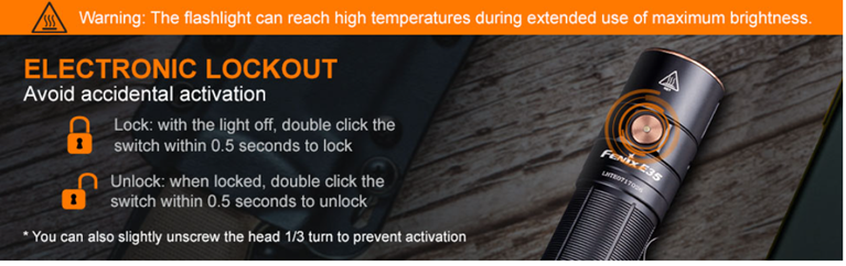 • EASY OPERATION - Press and hold the metal side switch to turn on or off. Hold over 1.2s to activate the strobe. Single click to cycle through brightness levels. A quick double tap locks the light out to prevent accidentally turn on the light.