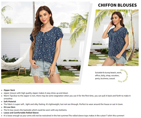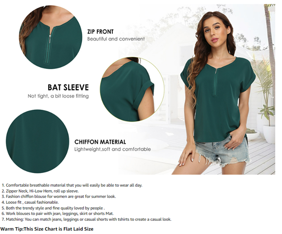 • Features:zipper closure,zip front,bat sleeve,short sleeve,loose fit,round neck,chiffon material,collar boxy sleeve.Made of soft and material and lightweight, keeps you cool on hot days.