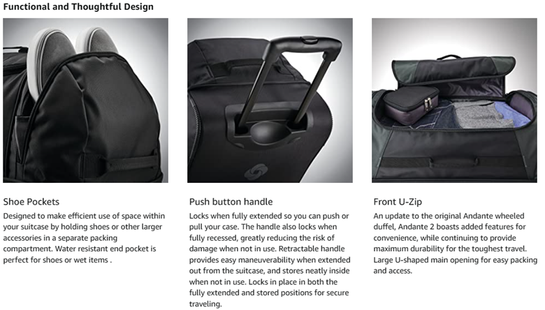 INTRODUCING NEW ANDANTE WHEELED DUFFELS. Andante 2 retains the function of the original and reinterprets it into casual lifestyle built for travel. A more refined look combined with added utility enhance the consumer experience, which strongly resonates with the Samsonite brand compass. The duffels are constructed from a water resistant dobby polyester, and have a locking pull handle with smooth rolling wheels. Exterior grab handles provide the means to quickly grab the bags from a variety of points. The drop bottom (2 larger sizes), and large U-shaped opening make packing and finding belongings a breeze. Available in three sizes and three colors Andante 2 will delight the consumer.