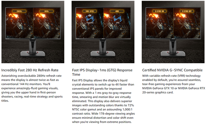 The 27” ASUS TUF Gaming VG279QM features Fast IPS technology which enables 1ms (GTG) response time for sharp gaming visuals with high frame rates at 280Hz refresh rate (overclocked). Enjoy a super-smooth gameplay with ASUS-Exclusive ELMB Sync Technology which enables motion blur reduction and adaptive sync technology to be used simultaneously.