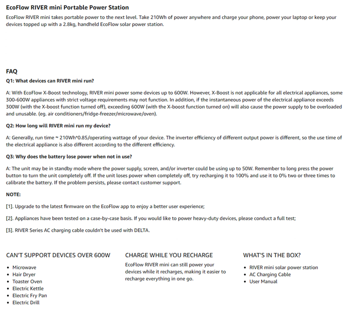 • WHAT YOU GET: You will receive 1* RIVER mini solar power station; 1* AC Charging Cable; 1* User Manual. Buy EcoFlow power station with Confidence: 30-day money back guarantee, 2-year warranty, and friendly customer service.