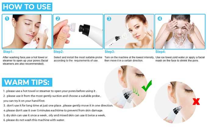 • ? Recommended Gradually Increase the Level – Before using the vacuum pore cleaner , please use a hot towel or facial steamer to open your pore. Our blackhead remover vacuum provides LED digital display for showing the suction level,Please don't use the blackhead remover in one place for more than 5 seconds , just gentlely slide the pore vacuum up and down in one direction .