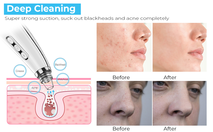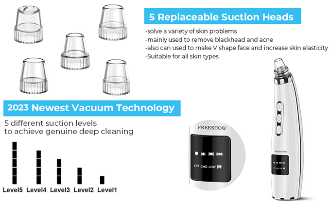 • ? 5 Suction levels & 5 Suction Probes – 5 Different powerful suction levels suitable for different types of skin to achieve genuine deep cleaning. Level 1 is suitable for sensitive and dry skin, level 2-3 are suitable for neutral skin, level 4-5 are designed for mixed and oily skin. Meanwhile , 5 replaceable probe are designed for different skin conditions,such as: clean up blackhead, remove dirt grease on the skin, reduce dead skin and fine lines