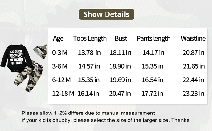 • √ Unique design of Baby Boy Outfit–Baby boy romper top with botton opening for easy wear . "COOLER VERSION OF DAD" printed stylish bring impressive and eye-catching feelings . Elastic waistband camo long pants make for easy dressing and bring convenience for movement.It also has a hat for your boy . Your boy will be the handsome one.