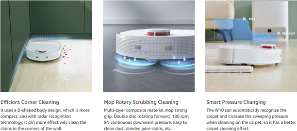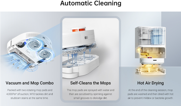 • 【Sweeping, Mopping, Washing, and Drying 4-in-1】 Intelligent return cleaning of the mop and hot air drying make your cleaning healthier and cleaner. the W10 robot vacuum is equipped with a 4L clean tank and a 4L sewage tank, no need to change the water frequently, free your hands.