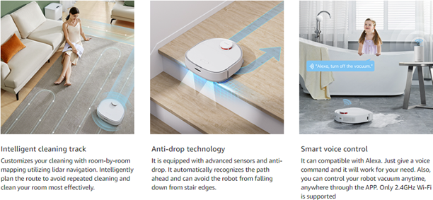 • 【Wifi & Smart Voice App Control】W10 is compatible with Alexa & Google Assistant. App remote control allows you to adjust suction power, set virtual No-Go zone, and zone clean, multi-layer maps, schedule cleaning, etc; Once connected to Alexa, the robot responds to your voice orders immediately, which makes your cleaning more intelligent; W10 Robot Vacuum works with 2.4GHz Wifi