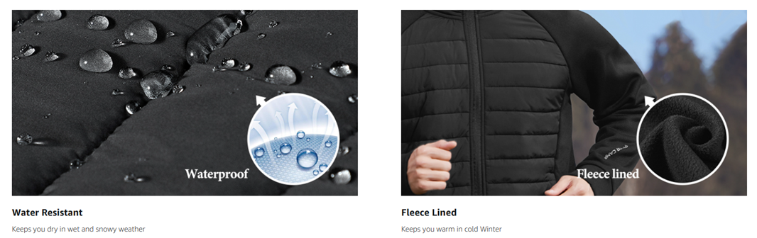 ?WARM & WATER RESISTANT: Hybrid design. Waterproof and windproof front parts with quilted panels sewn into to insulate cold air and retain warmth of core area. Stretching knitting materials on the side and back panels are highly breathable, wicking away moisture quickly and can keep you dry. Brushed fleece lining provides extra warmth.