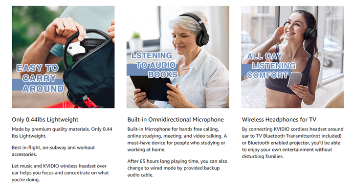 - WIDE COMPATIBILITY: Simply press multi-function button 2s and the over ear headphones with mic will be in ready to pair. KVIDIO wireless headsets are compatible with all devices that support Bluetooth or 3.5 mm plug cables. With the built-in microphone, you can easily make hands-free calls or facetime meetings while working at home
