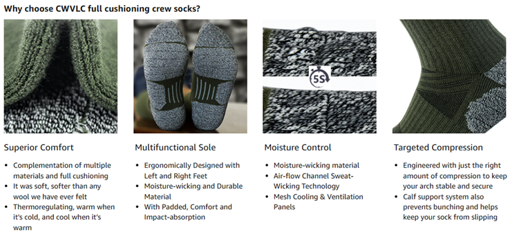 - About Moisture Wicking: New socks do Moisture-Wicking experiment, The superfine fiber on the surface of new socks will affect the effect of Moisture-Wicking, and the fiber will disappear after wearing; There is a limit to the material's ability to Moisture-Wicking, and if the limit is reached, it needs to be dried before the performance can be restored.