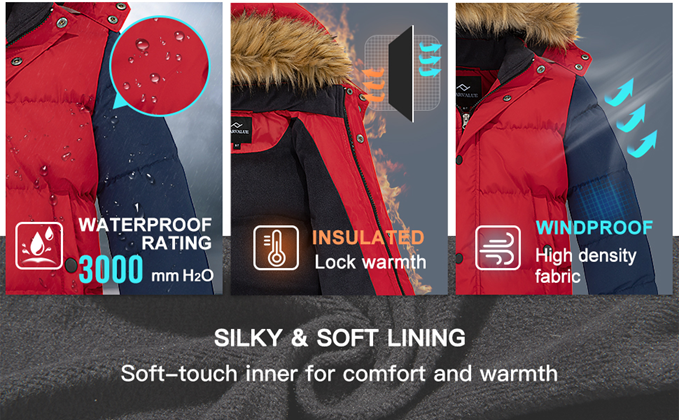 • Water-repellent Puffer Coat: Professional fabric with a waterproof index of 3000mm, this coat can fight light rainy or misty weather.