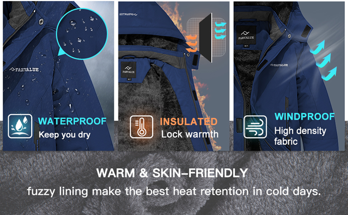 • Waterproof Snow Coat: Made from professional Durable Water Repellent (DWR) coated polyester fabric, which is windproof and durable. This coat can fights bad rainy or misty weather.