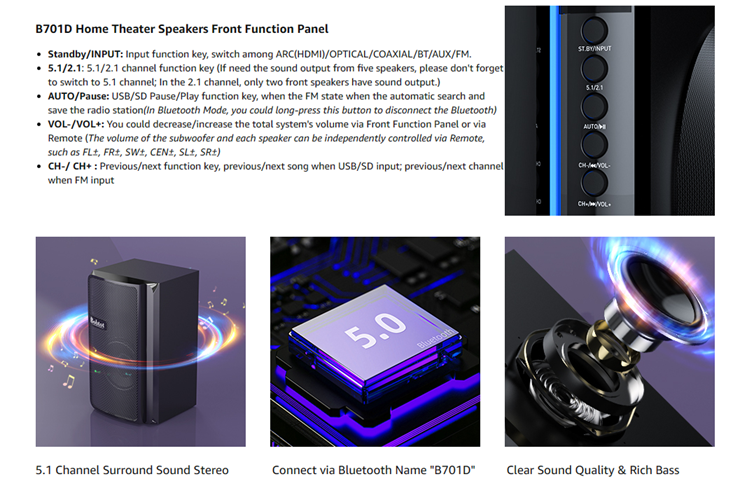 • All Function Remote: This system not only has button control via the front panel, but also come with remote control for more detailed operation. Such as you can independently control the volume of each speaker and the subwoofer via remote