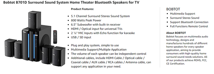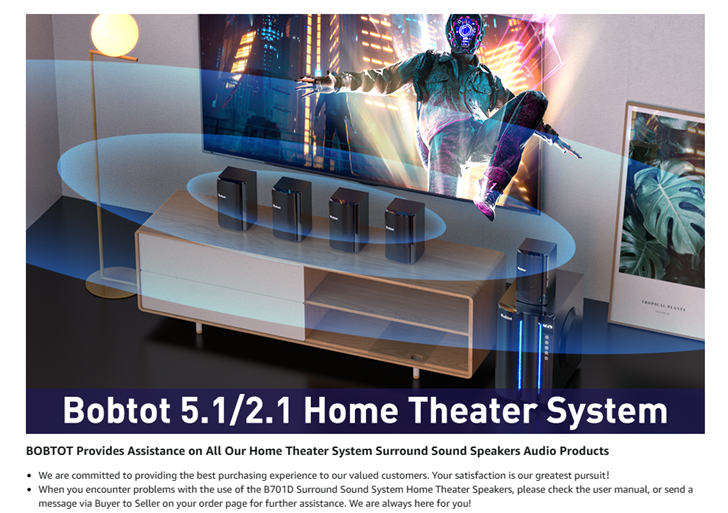 • 5.1 Channel Surround Stereo Sound: Bobtot Surround Sound System for TV has two modes of 5.1/2.1 channel, switch via remote control or front panel. Pro surround function provides you with more advanced enjoyment
