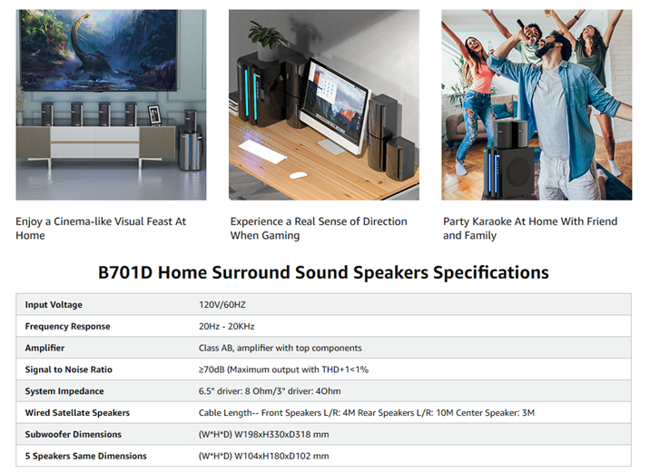 • Multiple Application: Just plug and play, speakers have many application scenarios such as Ultra HD 4K TV, game console, home DVD, PC, laptop, projector, or smartphone. It's very suitable for watching movies, watching football games, partying, and e-sports games with friends at home