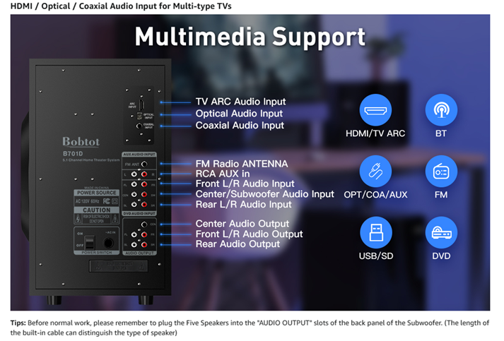 • Multimedia Support: Surround sound speakers can connect to various smart devices, and support multiple input modes like TV ARC/OPT/COA/AUX/USB/BT/DVD. Additional cables include HDMI cable/Optical cable/Coaxial cable/AUX cable/RCA Cable/Antenna cable that can support any application in need