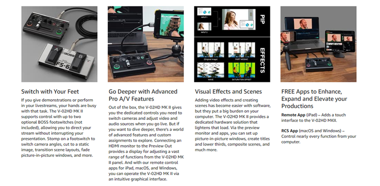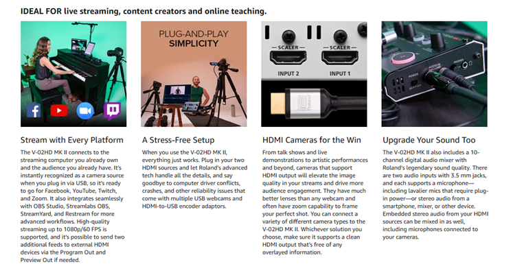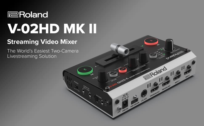 ROLAND V-02HD MKII – Streaming Video Mixer Step Up Your Livestreams Ditch the webcam and step up your livestreams with the Roland V-02HD MK II Streaming Video Mixer. Compact, affordable, and simple to use, this desktop device allows you to connect and switch two high-quality HDMI cameras and send them directly to your favorite streaming platform over USB-C. You can also mix in audio sources via dedicated inputs and HDMI, apply video effects and transitions, and more. With the V-02HD MK II, you have the interface you need to bring higher production values to your live video productions.