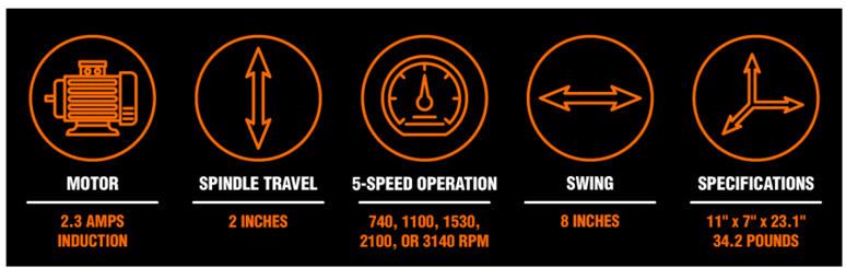Included Components‎2.3-Amp 8-Inch 5-Speed Benchtop Drill Press