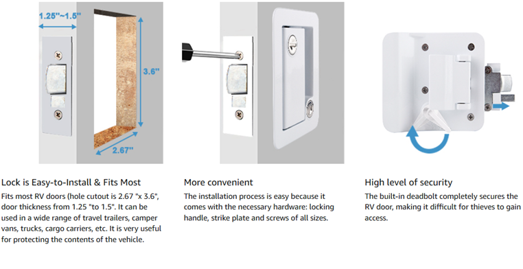 - 【Multi-Functional Door Lock】Our door lock is compatible with most RV doors, with a hole cutout of 2.67" x 3.6" and suitable for door thicknesses ranging from 1.25" to 1.5". This versatile lock is perfect for a wide range of vehicles, including travel trailers, camper vans, trucks, cargo carriers, and more. Its ability to secure your vehicle's contents makes it a valuable asset for any owner. Moreover, the lock is incredibly easy to install and fits most models without any hassle.