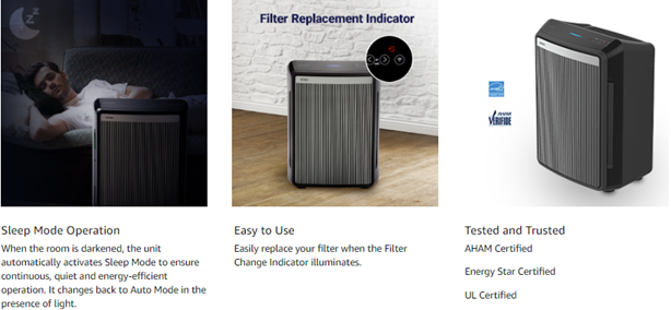 • Activated Carbon Filter: Reduces VOCs and household odors from cooking, pets, and smoke. It is designed to catch airborne particles found indoors, which also helps prolong the True HEPA Filter life