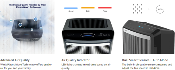 Winix True HEPA Captures 99.99%* of airborne allergens including pollen, dust, smoke, pet dander, and other ultrafine particles as small as 0.003 microns.