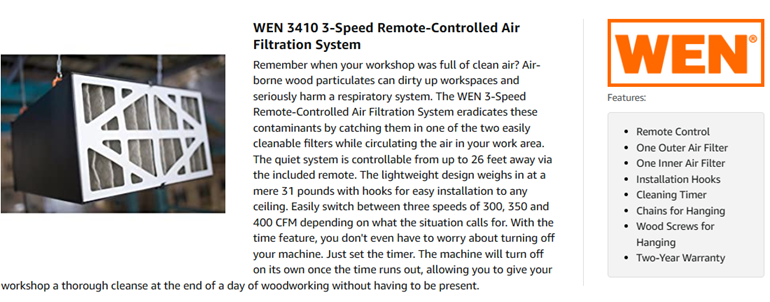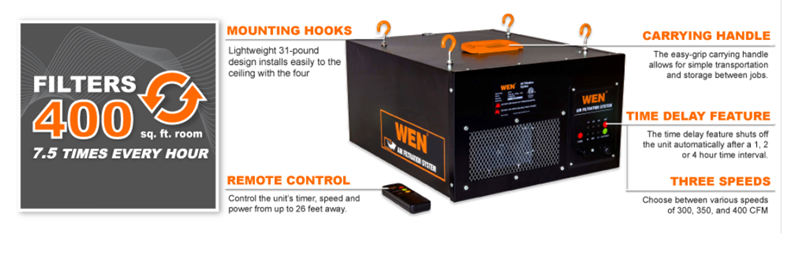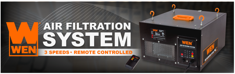 Remember when your workshop was full of clean air? Air-borne dust particulates can dirty up a woodworker's workshop and harm a healthy respiratory system, but with the WEN 3-Speed Remote-Controlled Air Filtration System, you no longer need to worry. This system eradicates these contaminants by catching them in one of the two easily cleanable filters while circulating the air in your work area. The powerful 1/6 HP motor leaves no stone unturned, collecting every contaminant in its path. Quiet system creates 50 to 60 dB of noise and is controllable up to 26 feet away with the included remote. The lightweight design weighs in at a mere 31 pounds. Combine this with the attached carrying handle and eyebolts for easy mobility, mounting and installation. The WEN Air Filtration System collects and releases the air in your workshop after filtering it through both a 5-micron outer filter and a 1-micron inner filter. Easily switch between three speeds of 300, 350 and 400 cfm depending on what the situation calls for. With the time feature, you don't even have to worry about turning off your machine. Simply set the timer and the machine will turn off on its own once the time runs out, allowing you to easily give your workshop a thorough cleanse at the end of a day of woodworking without having to be present. And because this is a WEN Product, your 3-Speed Remote-Controlled Air Filtration System is backed by a two-year warranty, a helpful customer service phone line, and a nationwide network of experienced technicians. Remember when you could breathe easy in your workshop? Remember WEN. Sound Output: 50-60 dB.