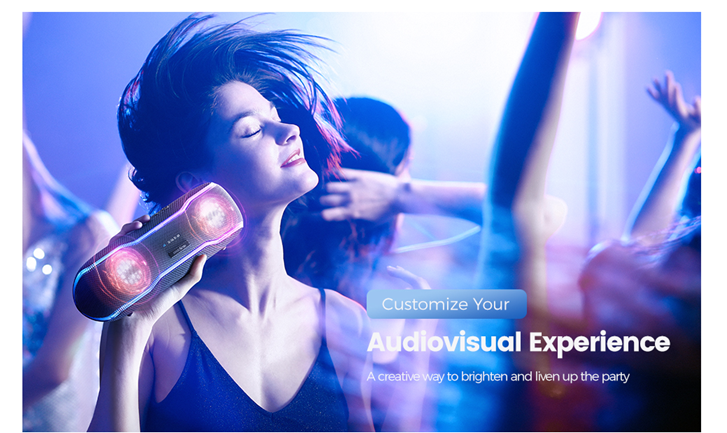 - [EQ Pulsing Colorful Light Show] Get the party started with crisp and clear sound and rock the party with multi-color flashing lights. A short press of the "Light Button" to enable the flashing colorful LED lights and livens up your party. The multi-color LED lights and two hidden speaker lights will sync to the beat of the music to create a pulsing light show.