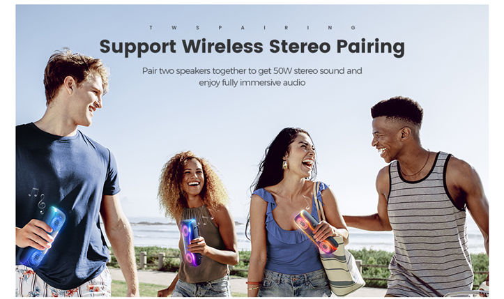 - [Loud Stereo Sound & Dual Pairing] Deliver surprisingly loud and well-balanced sound with virtually no distortion through 2 drivers and our proprietary technology. Enjoy up to 25W room-filling sound with punchy bass, strong midranges, and crisp highs. Pair 2 speakers together via Bluetooth to play the same music in perfect sync, double the volume, and create an immersive stereo sound experience. It is your perfect partner for playing games, listening to music and watching movies.