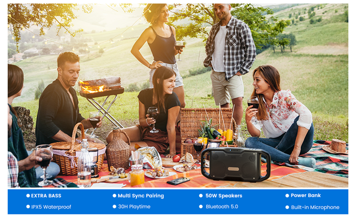 - 50W Louder Sound & Punchy Bass Technology: This 50W outdoor portable speakers use advanced T1 power amplifiers and dual speaker mode in order to further improve the sound quality.EX-Bass technology pumps up the bass and enhances the clarity of the mids and highs;this wireless bluetooth speakers has excellent sound, explosive and punchy bass ,it is an ideal home speaker and outdoor speaker for you
