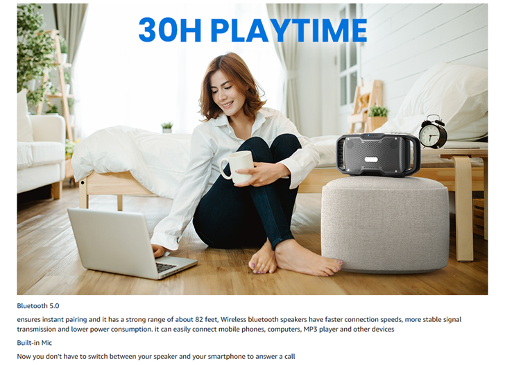 - 30H Playtime & Power Bank:This bluetooth speaker built-in rechargeable lithium ion battery and up to 30 hours of playtime. You can use this speaker to charge your smart phone via a USB cable. Enjoy the carnival without worrying about the power consumption of the device even if you are outdoor.You can also play music from your PC,TV,and other non-Bluetooth devices via the 3.5mm audio jack