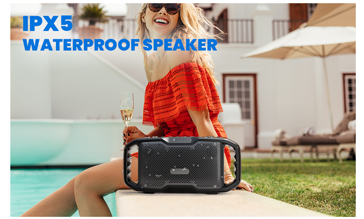 - IPX5 Waterproof: This Bluetooth Boombox speakers is totally Splashproof,Rainproof,is also a shower speaker;the speaker can resist gentle water spray and splash but cannot be partially or fully submerged.suitable for the Poolside, Beach, Patio, Yard, Garden, Bedroom, Parties, Camping, and more!