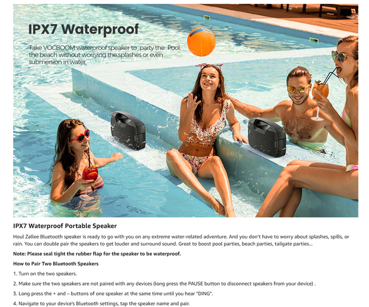 - IPX7 Waterproof Speakers - The Houl Zallee outdoor speaker is rugged enough for outdoor adventures and rigorously tested to meet IPX7 waterproof standards. It's fully water proof and can even float on water and survive being fully submerged in 3.3 feet of water for up to 30 minutes. So there is no need to worry when using it by the sea, the pool, on a boat, or in a shower room.The idea for outdoor adventures