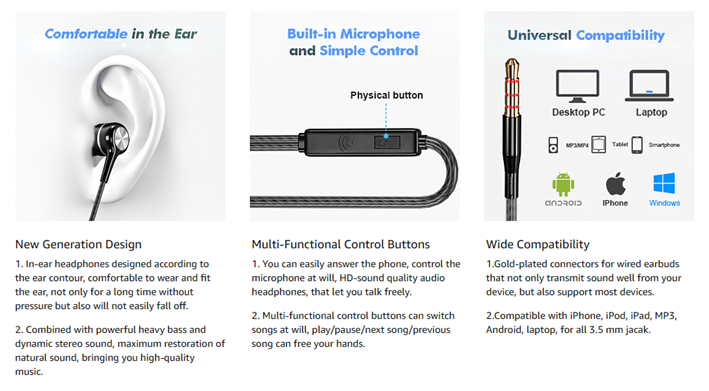- [Wide Compatibility] - Earphone are compatible with iPhone, iPod, iPad, MP3, Android, laptop, for all 3.5 mm connector.